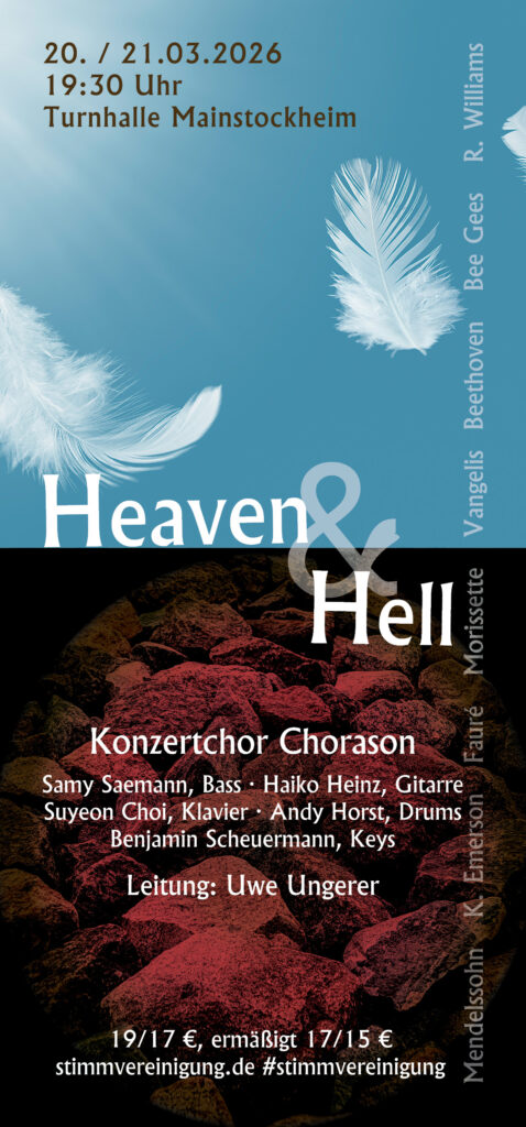 Veröffentlicht von Stimmvereinigung in 16. Februar 2026 Kategorien Allgemein Tags Chorasonkonzert am 20. und 21.03.2026"HEAVEN AND HELL"Turnhalle Mainstockheim Teilen Stimmvereinigung Comments are closed.